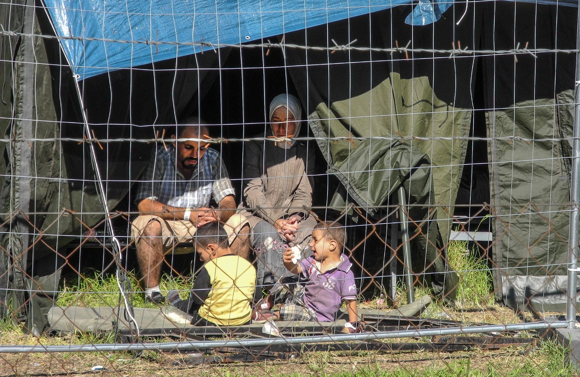 Flüchtlingsfamilie in einem Auffanglager in Röszke, Ungarn im August 2015